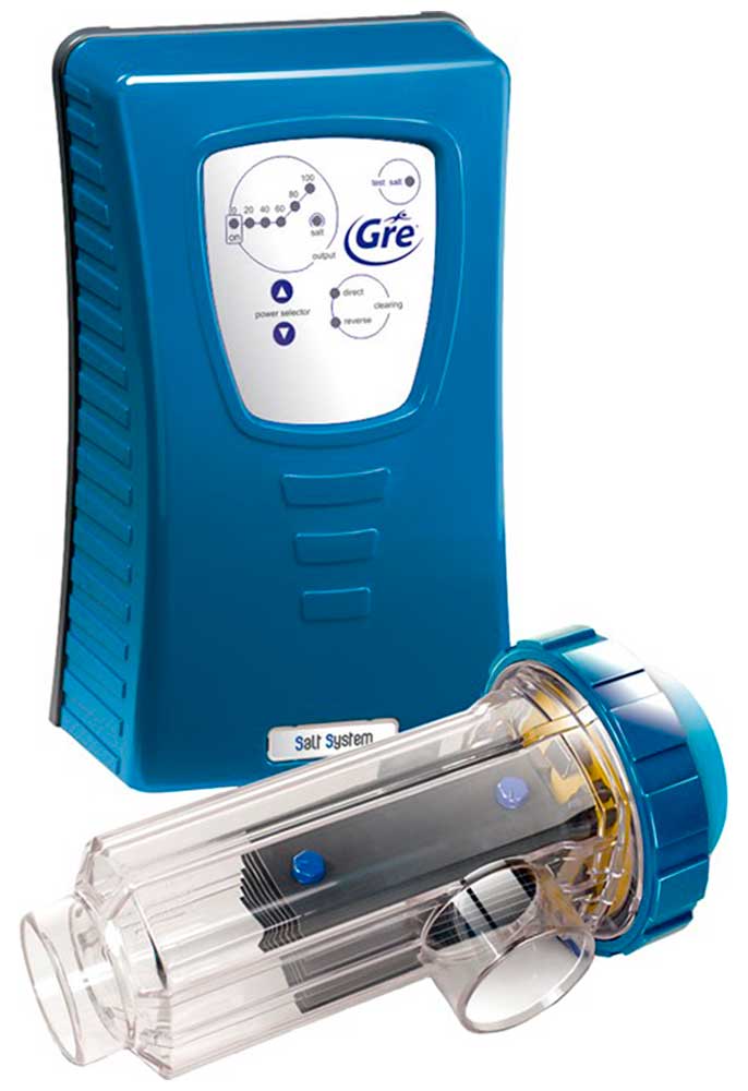 O sistema de Eletrólises de Sal, consta de dois elementos: uma célula de eletrólises e uma fonte de alimentação. A célula de eletrólises contem placas de titânio, de forma que quando se faz circular através dos mesmos, a corrente elétrica e a solução salina fusionam-se e produz o cloro libre. O mantimento de um certo nível de cloro na água da piscina, garantirá a sua qualidade sanitária. O sistema de Eletrólises de Sal, fabricará cloro quando o sistema de filtração este operativo. A fonte de alimentação, dispõe de vários dispositivos de segurança, os quais ativam-se em caso de um funcionamento anómalo do sistema, assim como de um micro-controlador de controle. Os sistemas de Eletrólises de Sal, dispõe de um sistema de limpeza automático dos elétrodos que evitam a fo Clorador Salino GRE