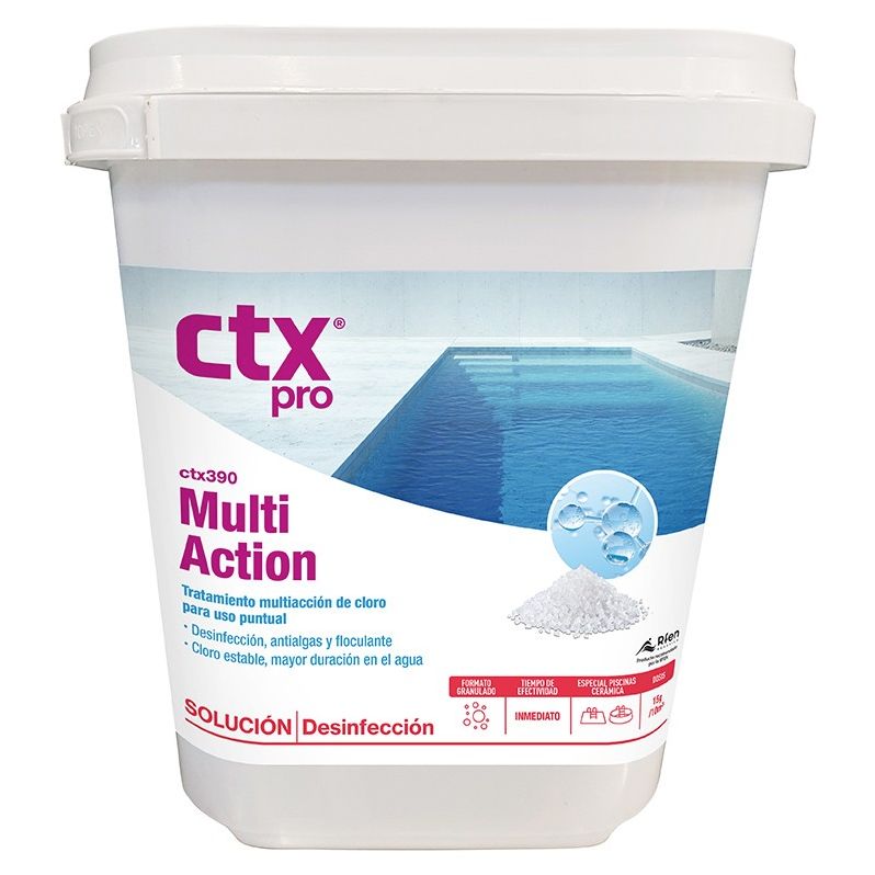 O CTX-390gr é um produto multi-ação granulada de dissolução lenta para o tratamento de água de piscinas. Ao ser multi-ação, tem uma ação desinfetante do cloro, floculante, algicida e estabilizadores ante a radiação solar.