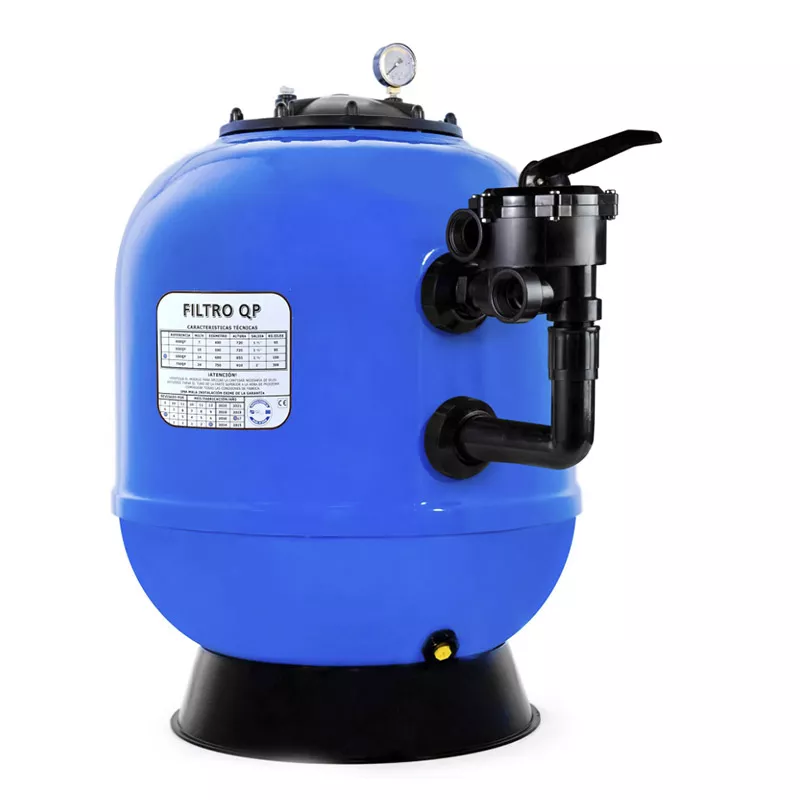 Filtro de areia laminado em poliéster. 4 modelos disponíveis Cor azul metalizado. Com válvula seletora de 6 posições. Para piscinas com máximo 200 m³. Manómetro incluído. Com base circular de apoio. Para piscinas privadas e de condomínios.Filtro de piscina QP Azur cor azul metalizado
