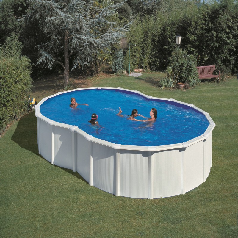 Piscina de aço de grande qualidade com forma de rim, estrutura de chapa e perfis de aço e liner de PVC de grande qualidade com grossura de 40/100 cor azul. Piscina de cor branca e proteção de plástico nos suportes. Está desenhada para manter a sua instalação durante todo o ano.| Modelo | Dimensões exteriores (m) | Altura (m) | Capacidade (litros) | Filtro de areia (m³/h) | Tapete de chão | Escada | Liner | Espaço necessário (m) |