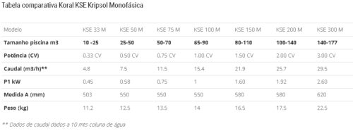 A bomba de filtração Koral Kripsol oferece-nos potências de 0,33 CV com 4,8 m3/hora até 33 m3/hora no modelo mais potente de 3CV. Na tabela abaixo, o fabricante Kripsol indica os níveis de caudal en m3/hora que têm cada uma delas. É importante ter em conta o tipo de filtro que temos ou queremos, diâmetro, volume de água e as nossas necessidades, para não comprar um modelo que seja incompatível e assim tudo irá funcionar em equilibrio.