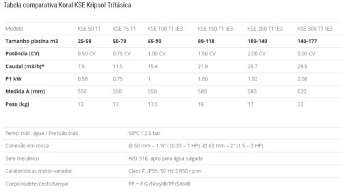 As bombas de filtração Koral KSE Kripsol de potências Trifásicas em 1CV até 3CV, estão fabricadas com regulamentações de consumo e eficácia energética da União Europeia.Selo mecânico AISI 316 para água salgada