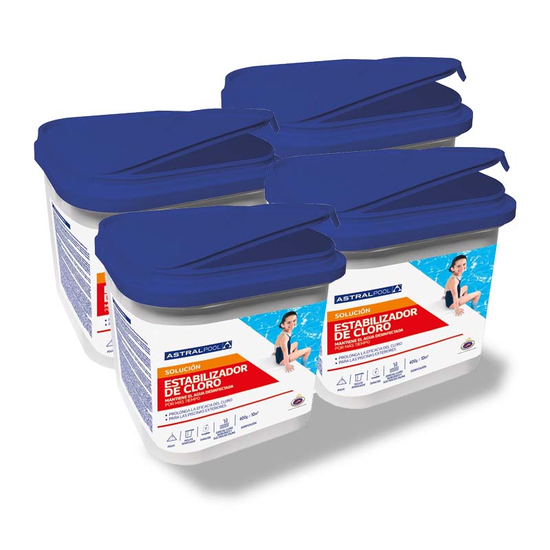 Pack de 4 embalagens de 5 Kg O estabilizador de cloro sólido da marca AstralPool prolonga a ação do cloro da piscina. Graças a este produto evita-se a destruição do cloro que causam os raios ultravioleta do sol, prolongando assim também a sua ação desinfetante.