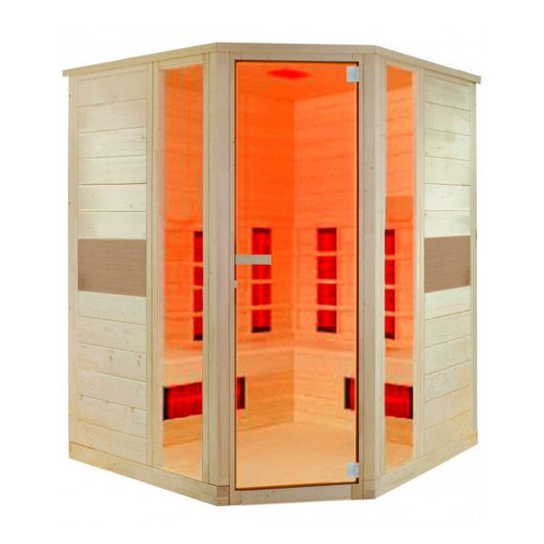 A sauna Ruby Corner da gama Interline, funciona mediante raios infravermelhos que penetram diretamente na pele, aquecendo todo o organismo e dando os benefícios que se formam a raiz de este aumento da temperatura. A sua tecnologia, em comparação com as saunas tradicionais, as de vapor, permite que o calor se distribuía de forma uniforme por todo o interior da cabine ao ter diferentes painéis halogênios distribuídos por todo o recinto. Alcançamos uma temperatura máxima de 50ºC, aproximadamente, pelo que as sessões de banho podem ser mais longas e chegar aos 45min. Ao não existir o componente do vapor, a respiração é mais leve, o que também facilita a prolongação dos ciclos de banho. Este modelo de sauna está desenhado para instalar-se numa esquina. A sua forma não quadrada permite situá-la numa esquina de casa, adaptar-se ao espaço disponível e encaixar de maneira subtil com a decoração do seu lar. Fabricada em madeira de Hemlock com origem no Canadá, um material muito favorável à hora de repartir o calor de maneira igual por toda a sauna. Outra das suas caraterísticas mais atrativas, no que diz respeito ao desenho, é a sua grande porta vidrada. Permite observar o exterior através da sua larga parede de vidro e evita a possível sensação de angustia ao estar num espaço pequeno. Relaxe numa posição confortável e esqueça o stress diário e os problemas que o afligem. A sauna Ruby formará parte do seu momento pessoal de calma e relaxação. Aliviar tensões e mau estar muscular na intimidade da sua própria sauna. O modelo Ruby Corner foi fabricado com uma capacidade máxima de 2 pessoas, pelo que poderá partilhar o seu momento de paz.Aspetos da sauna Ruby Corner