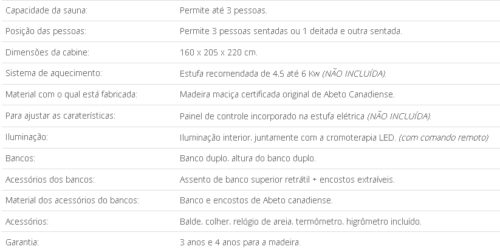 A porta é de vidro temperado e tem 50 cm de largura. As janelas de vidro a cada lado e a grande superfície de cristal com persianas de madeira criam um ambiente agradável, o que permite desfrutar do banho de vapor enquanto desfruta da paisagem ao ar livre. Conta com 160 cm de profundidade, 205 cm de largura e altura de 220 cm.